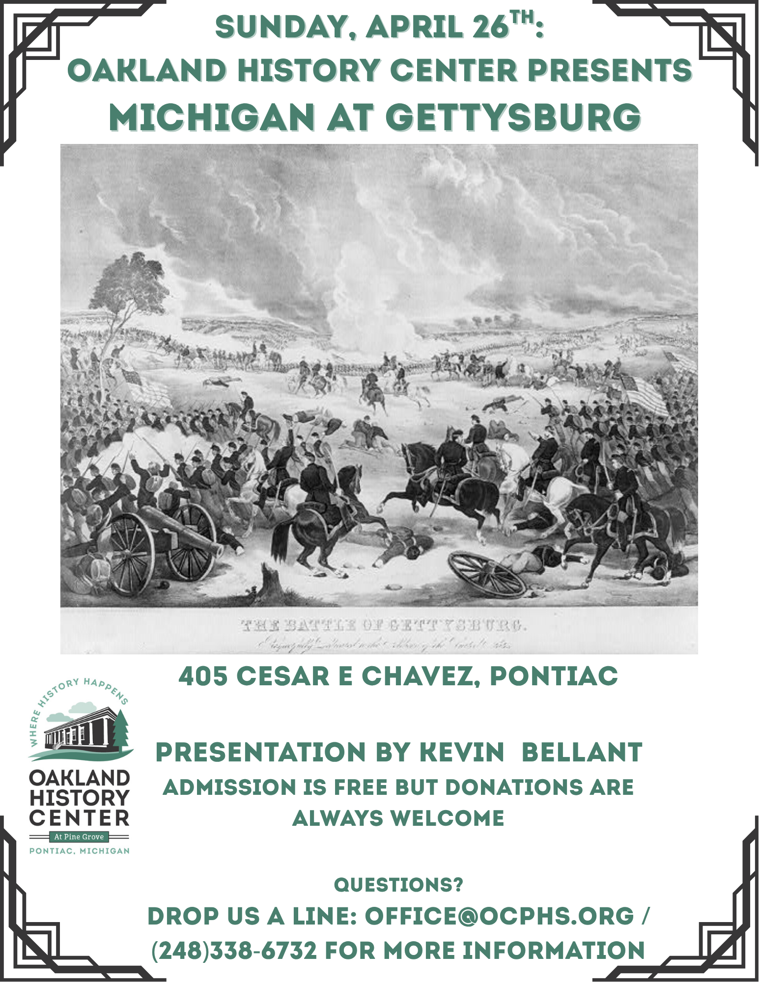 Small Talk - Michigan at Gettysburg Our small talks return! Join us on Sunday, April 26th at 1pm as presenter Kevin Ballant illuminates Michigan's role in the pivotal Battle of Gettysburg. Light refreshments provided. Admission is free, but donations are always appreciated.