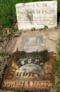 Rev. Frey’s headstone is broken, with the top half of the stone laying prone in front of the lower half, which is still standing.