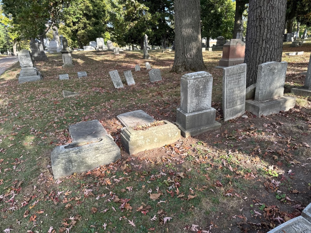 Thomas’ monument is broken at the base and is on the ground.